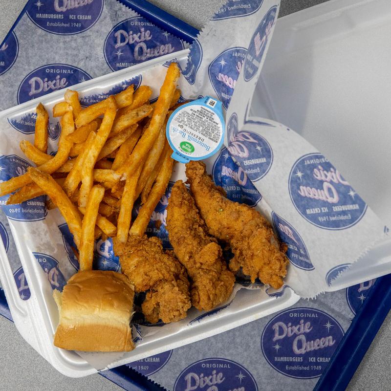 Three-piece chicken tenders. Choose from Pepsi, Diet Pepsi, Dr. Pepper, Lemonade, Mountain Dew, Root Beer, or Sweet Tea. Served with regular or seasoned fries.