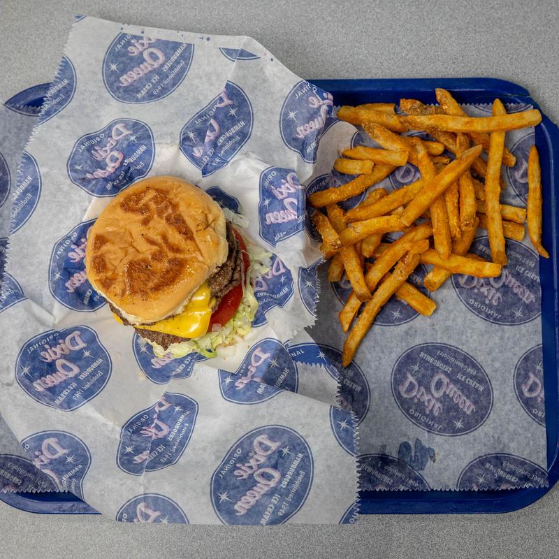 Cheeseburger with choice of drink: Diet Pepsi, Dr. Pepper, Lemonade, Mountain Dew, Pepsi, Root Beer, or Sweet Tea. Served with regular or seasoned fries.