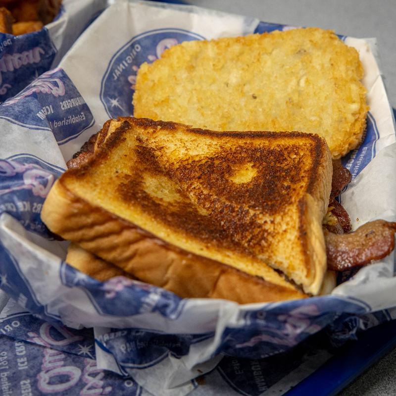 Bacon and egg breakfast sandwich. Choice of egg preparation: Over Easy, Over Hard, or Over Medium.