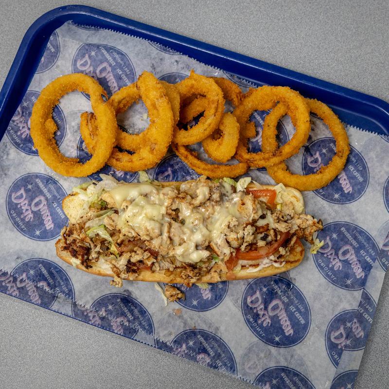 Grilled chicken with sautéed onions, green peppers, mushrooms, and provolone cheese on a hoagie roll. Typically includes lettuce, tomato, and mayo.