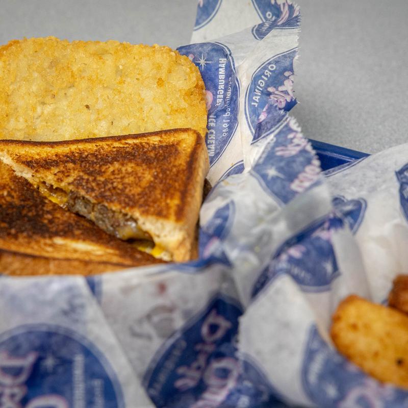 Triple cheeseburger with choice of drink (Diet Pepsi, Dr. Pepper, Lemonade, Mountain Dew, Pepsi, Root Beer, Sweet Tea) and fries (regular or seasoned).