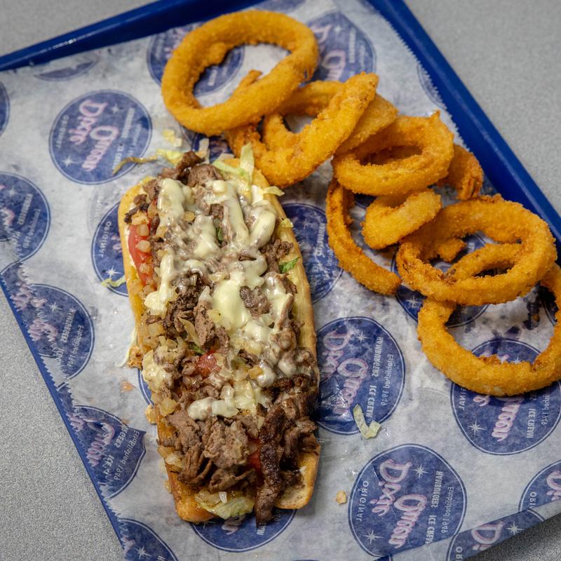 Juicy hamburger combo with choice of Diet Pepsi, Dr. Pepper, Lemonade, Mountain Dew, Pepsi, Root Beer, or Sweet Tea. Accompanied by regular or seasoned fries.